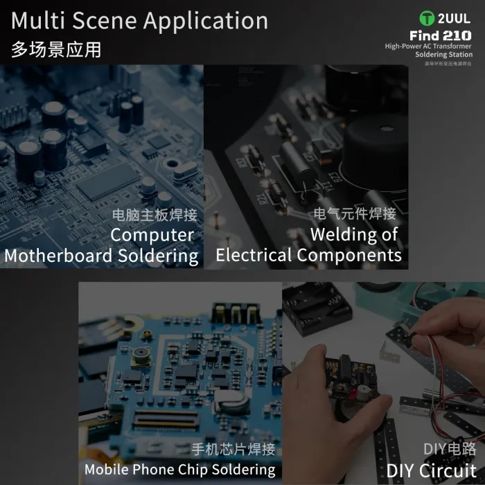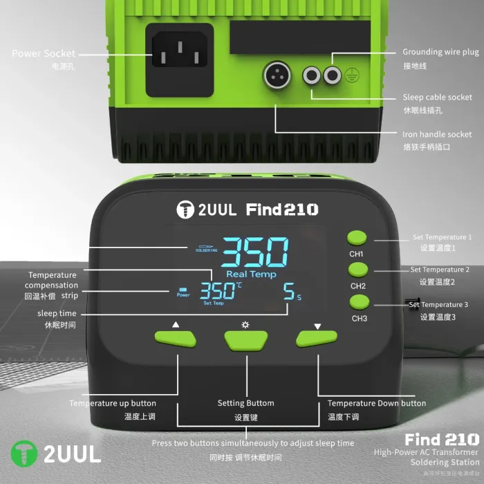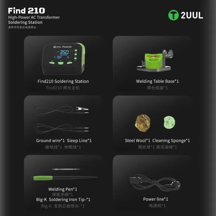 The 2UUL FD01 FIND210 is a high-power AC transformer-based soldering station designed for precision soldering tasks, especially in mobile phone repair, electronics maintenance, and micro-soldering applications. Below is a detailed breakdown of its uses: