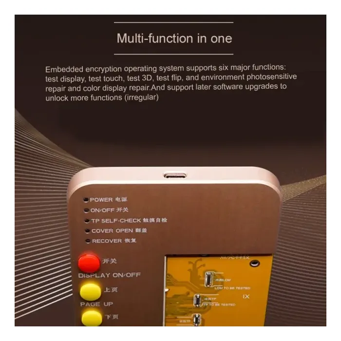 - Automatic test screen flip cover off function: Apple original flip cover with the screen to use, automatically brighten the screen when flipping, automatically off when the cover is closed; this test box can automatically test whether the screen can match the original Apple Use with a flip cover;