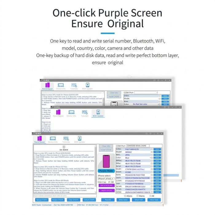 - One key to read and write the serial number, Bluetooth, WiFi, model, country, color, camera, and other data