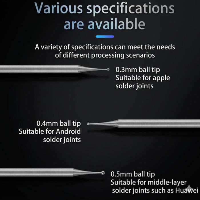 - 0.3mm is suitable for Apple solder joints/0.4mm is suitable for Android /0.5mm is suitable for middle-layer big points such as Huawei