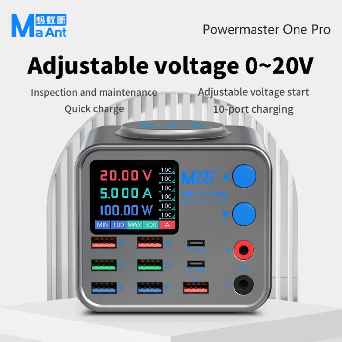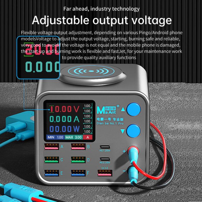 The MAant DianBa No.1 Pro is a professional-grade, multi-functional smart charging station designed for both general device charging and advanced mobile phone repair and maintenance. It integrates fast charging capabilities, precise voltage and current detection, and specialized diagnostic functions into a compact and powerful unit. This manual provides essential information for safe operation, setup, and utilization of all its features.