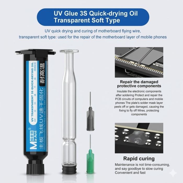 - Insulation protection is provided for electronic components after soldering: Repair the peeling or damage of the solder mask layer on the PCB circuit board of computers and mobile phones. Fix the flying wire to protect the components