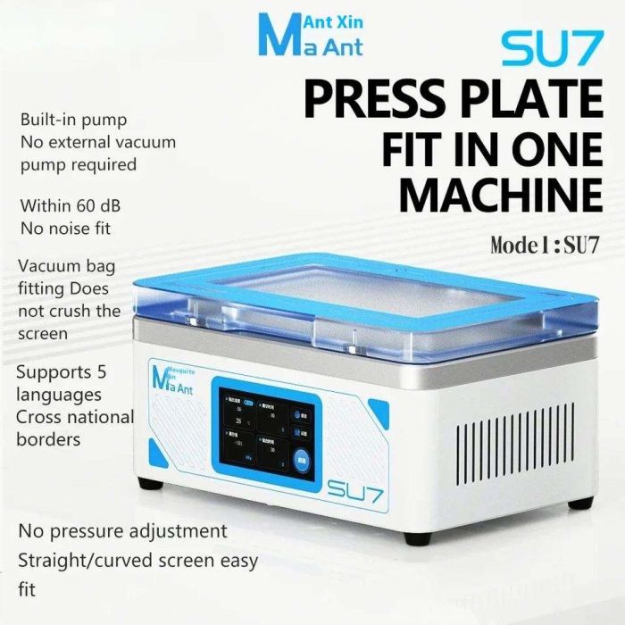 - SU7 fixes the machine, a simple and powerful laminator, one-click start, built-in pump noiseless fit, straight/curved screens are common, no need for an external vacuum pump, air compressor, supports 5 languages