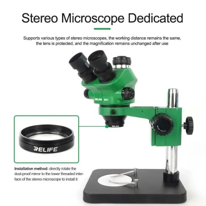 - Installation method: directly rotate the dust-proof mirror to the lower threaded inter-face of the stereo microscope to install it