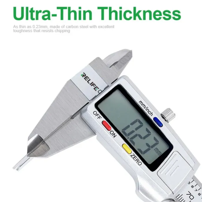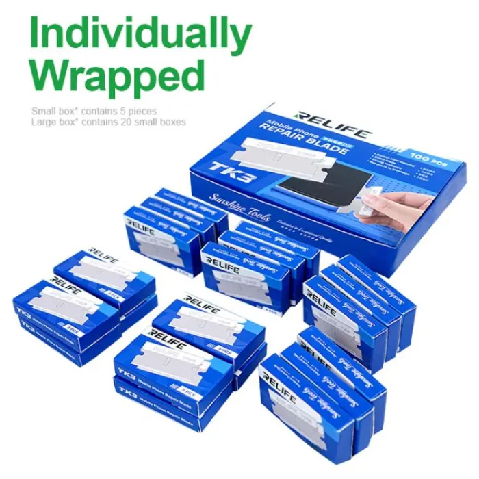 RELIFE TK3 is a set of 100 mobile phone repair blades designed for screen removal and adhesive cutting. These blades are suitable for smartphone repairs and screen disassembly, providing durability and precision.