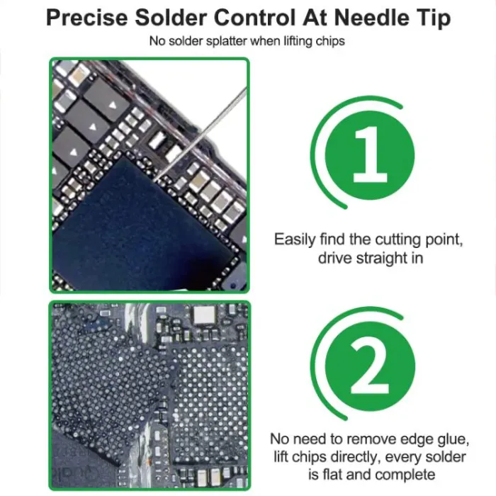 3.Precise solder control at needle tip,No solder splatter when lifting chips.
